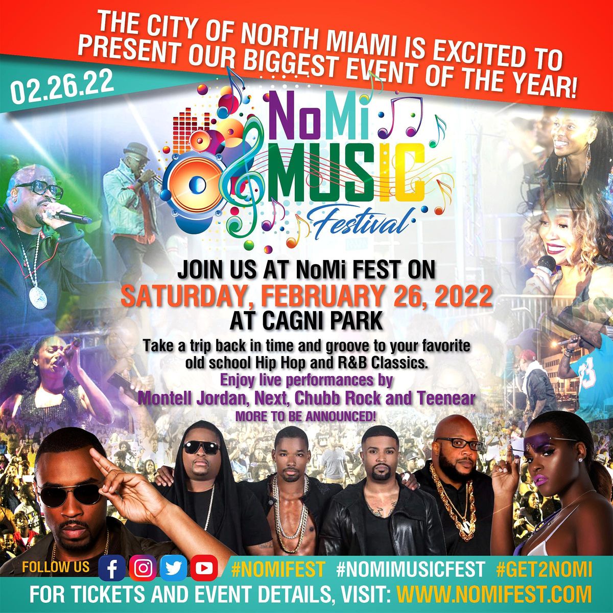Every February, the City of North Miami hosts this highly anticipated signature old school music event! It is an unforgettable night featuring live performances, a DJ spinning your favorite old school hits, food and friends gathered under the stars of North Miami. In past years, NoMi Music Fest has featured a line-up of old school Hip Hip and R&B artists such as Monica, Ceelo Green, Jagged Edge, Case, 112, and Dru Hill.