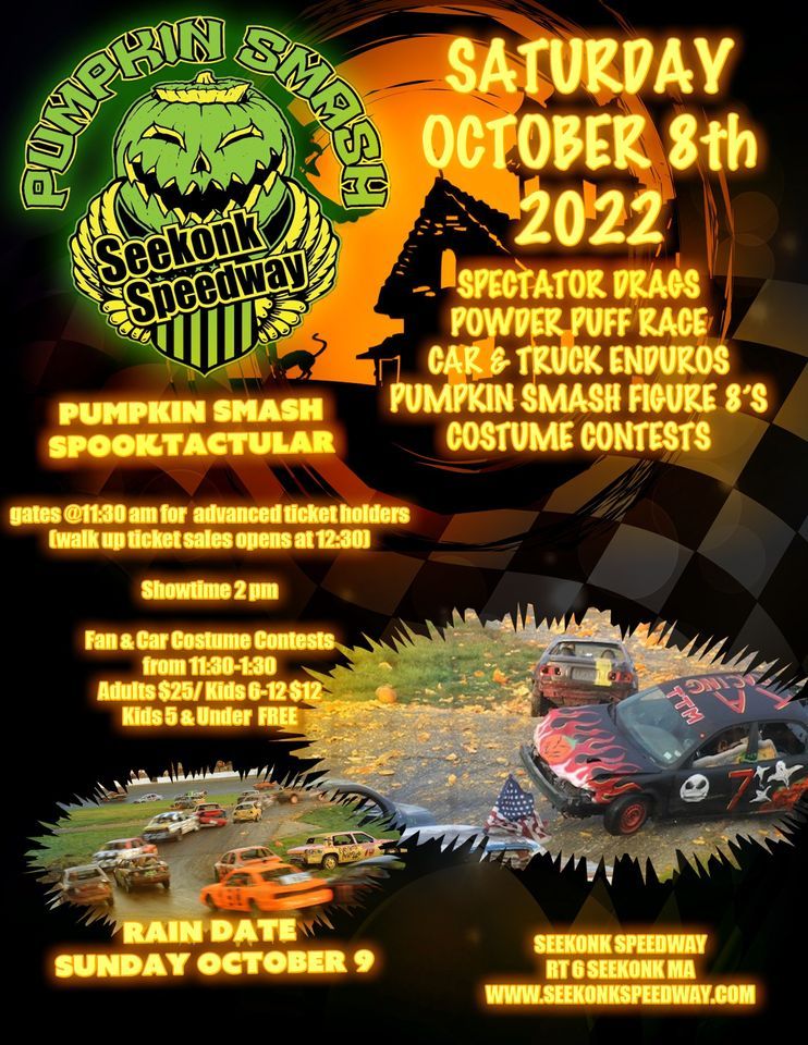 Spectator Drags, Car & Truck Enduros, Powder Puff Races, Fan & Car Costume Contests and Figure 8 PUMPKIN SMASH. Gates open at 11:30 am for advanced ticket holders only