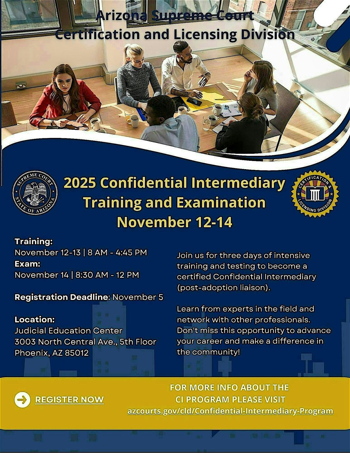 Welcome to the Arizona Supreme Court 2025 Confidential Intermediary Training happening November 12-14! Join us for three days of intensive training and testing to become a certified Confidential Intermediary (post-adoption liaison). Learn from experts in the field and network with other professionals.