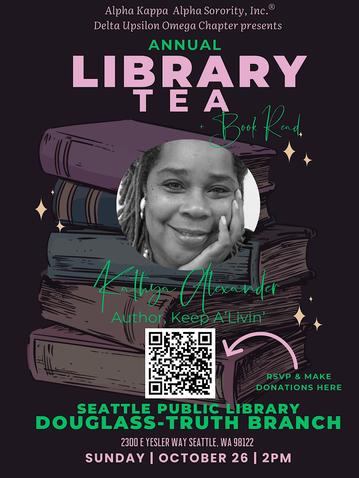 This is the Annual Library Tea in Support of the African American Collection at the Douglass-Truth Branch of the Seattle Public Library. Delta Upsilon Omega was instrumental in helping preserve this Library Branch as a whole and in establishjng and curating the collection here. Join us as we hear a bit of historical fiction written by author Kathya Alexander.
