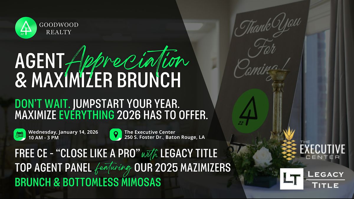 Welcome to the 2026 Agent Appreciation & MAXIMIZER™ Brunch happening at The Executive Center on January 14, 2026 at 10:00 AM! Join us for a day filled with networking, delicious food, and engaging conversations.