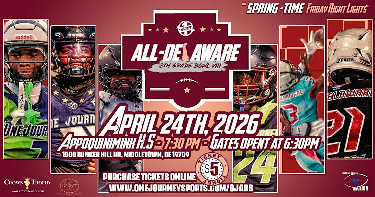 The One Journey All-Delaware 8th Grade Bowl is a Showcase Game played featuring the top 8th grade football players from around the State of Delaware. Game will be played April 24th, 2026 at Appoquinimink High School (1080 Bunker Hill Rd, Middletown, DE 19709). Game starts at 7:30pm, gates open at 6:30pm.