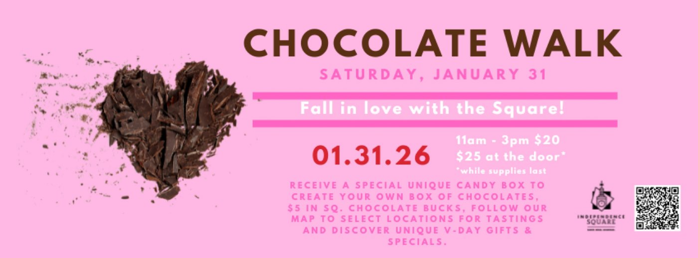 Walk the historic Independence Square while indulging in Chocolate! Check-in at Wild About Harry (104 W Maple Ave.) from 11 am - 12:30 pm where you will receive box for collecting samples and a map for the walk. Take advantage of sales and specials while sampling a variety of chocolate with options at several places to buy an entire stash. Many stores will also have gift ideas for your Valentine - even if that is you! You will also receive $5 in Square Chocolate Bucks - redeemable at our Square merchants (not at the pop-ups) on January 31, 2026 only.