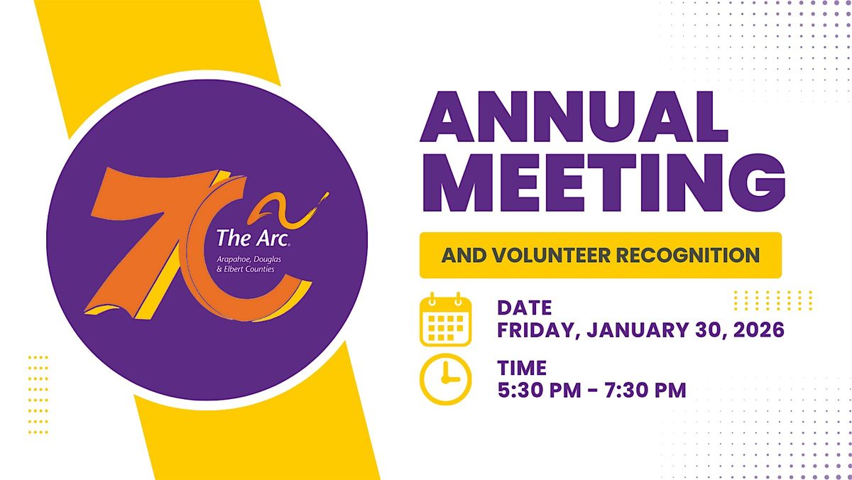Come join us for food and fun while you learn about the work The Arc Arapahoe, Douglas & Elbert Counties accomplished on behalf of individuals with intellectual and developmental disabilities in 2025. This year is especially meaningful as we celebrate our 70th anniversary—a milestone that reflects decades of partnership, advocacy, and community leadership.