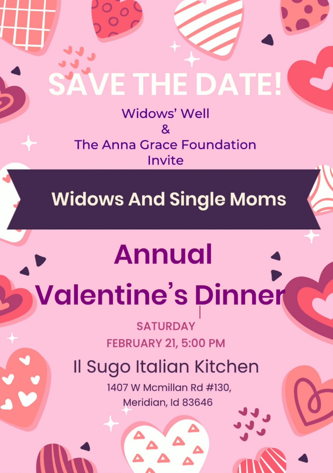 Welcome to the 2026 Ladies Valentine's Dinner for Widows and Single Parents! Join us for a heartwarming evening at il Sugo Italian Kitchen. This event is specially organized to celebrate and honor the incredible women in our community. Come together for a delicious meal, good company, and a chance to make new friends. Let's create unforgettable memories and cherish the spirit of love and support. Don't miss out on this special gathering – reserve your spot today!