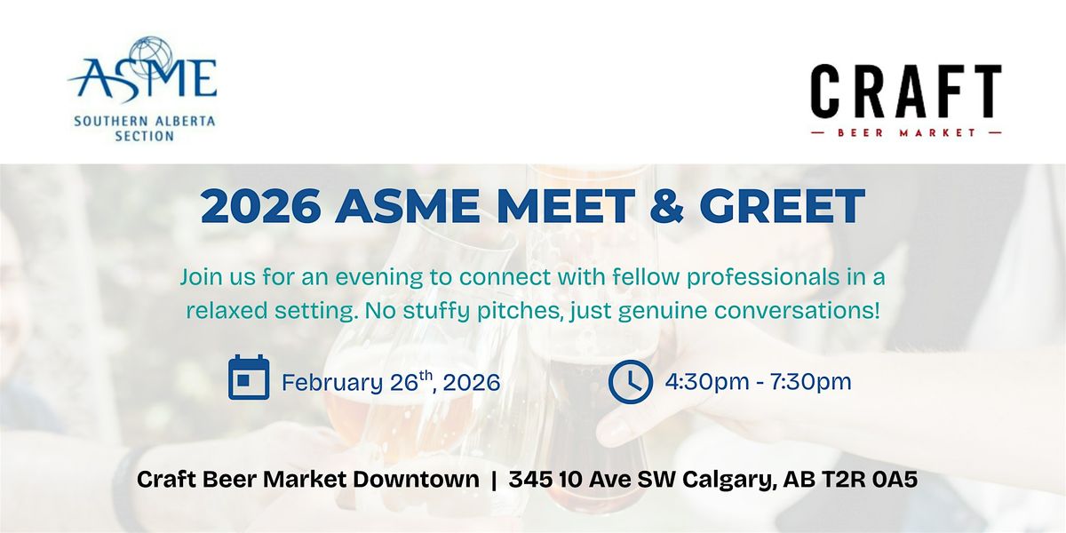 ASME Southern Alberta Section invites you to join our 2026 ASME Meet and Greet. Come network with others in the community, learn more about our section, and provide feedback on what types of events you would like to see us organize. Appetizers and one drink ticket will be included.