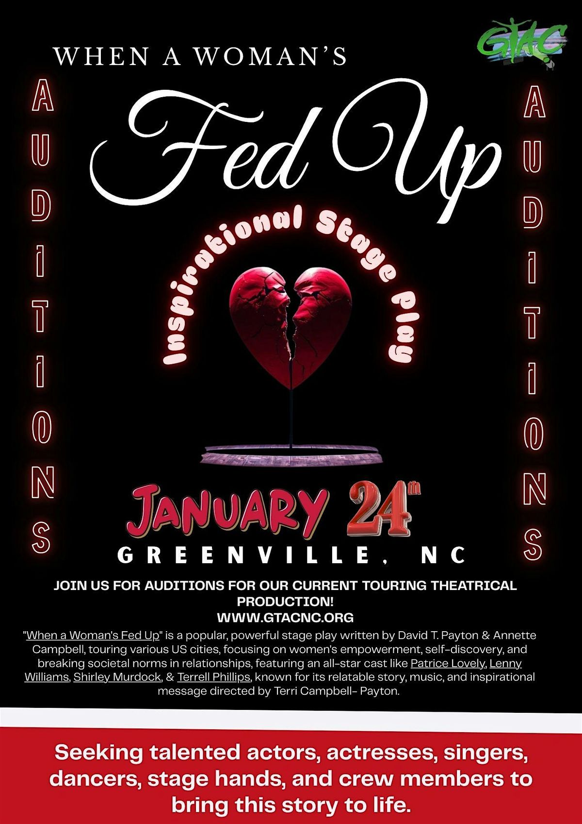 Join us Saturday, January 24th, 2026 for Auditions for the 2026 GTAC Season at the Roxy Theater on 629 Albemarle Avenue, Greenville, NC 27834. For more information and to sign up for a time slot today at www.gtacnc.org or www.futureent.org!