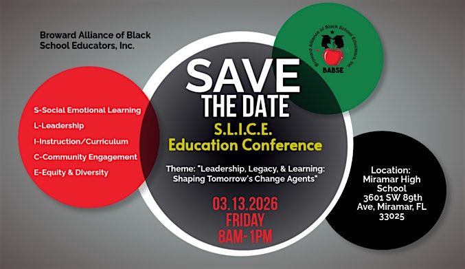 The Broward Alliance of Black School Educators, Inc. is hosting this year's BABSE S.L.I.C.E. Conference (Social and Emotional Learning, Leadership, Instruction and Curriculum, Community and Equity and Diversity) is scheduled for Friday, March 13, 2026, from 8:00 AM-1:00 PM, at Miramar High School (3601 SW 89th Ave, Miramar, FL 33025).