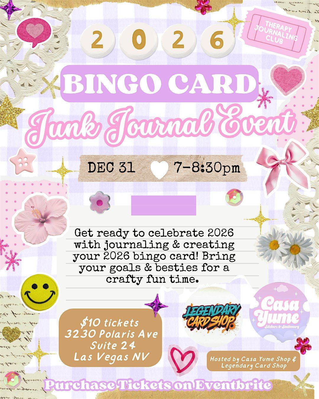 Join us for a super fun in-person 2026 Bingo Card Junk Journal Event where you’ll get to unleash your creativity! ready to unleash your creativity and learn how to turn ordinary items into beautiful journal pages. No experience necessary, just bring your enthusiasm and we'll provide all the materials. Dress to impress & don't forget your 2026 goals!
