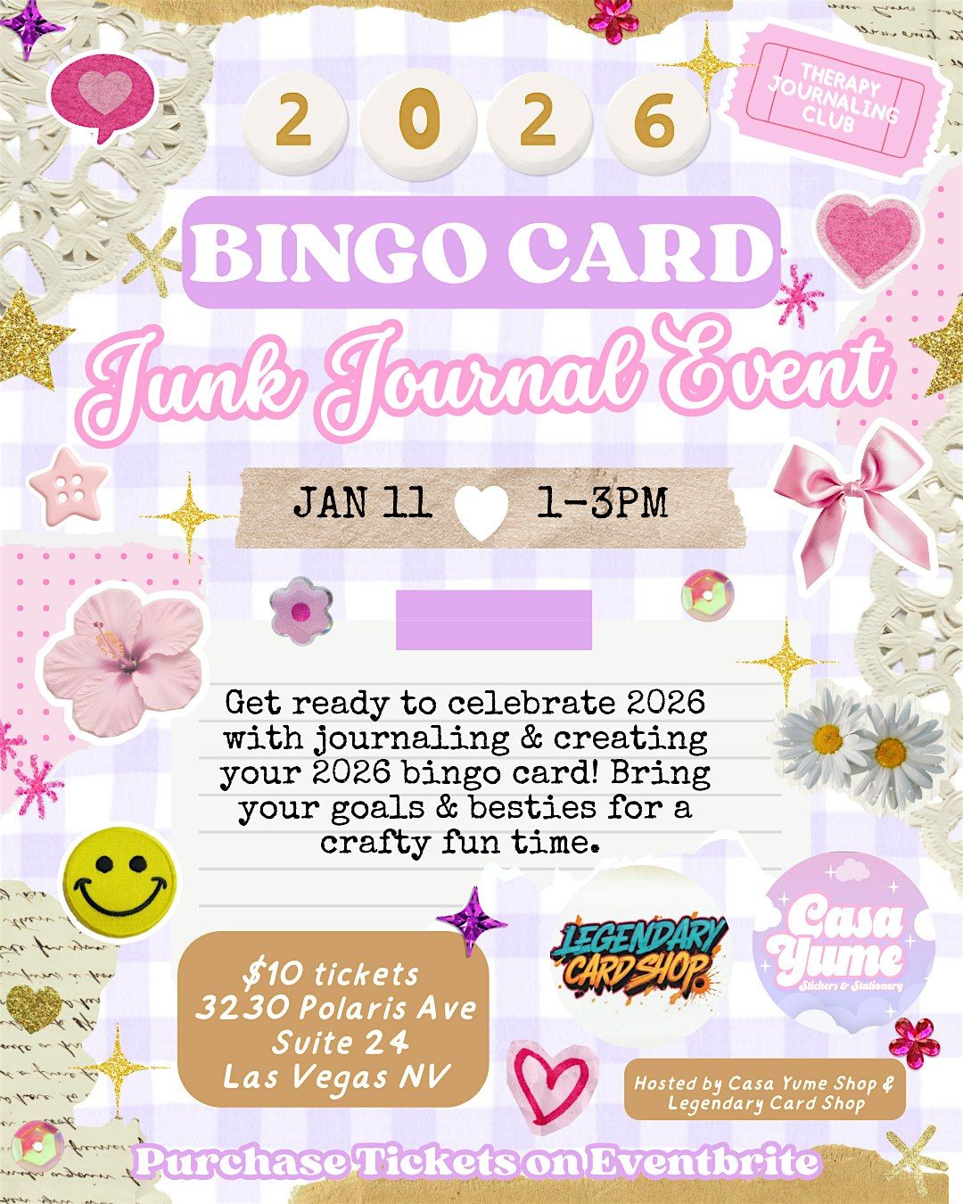 Join us for a super fun in-person 2026 Bingo Card Junk Journal Event where you’ll get to unleash your creativity! ready to unleash your creativity and learn how to turn ordinary items into beautiful journal pages. No experience necessary, just bring your enthusiasm and we'll provide all the materials. Dress to impress & don't forget your 2026 goals!