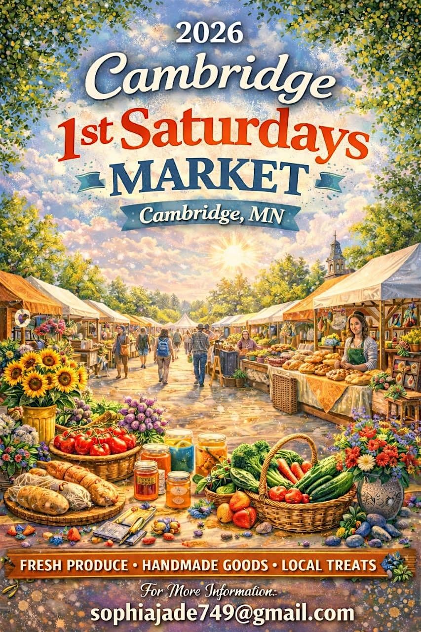 Join us at the 2026 Cambridge 1st Saturdays Market in Cambridge, MN! Explore a lively community market featuring fresh produce, handmade goods, local treats, and unique crafts. Enjoy a family-friendly atmosphere with vibrant stalls, friendly vendors, and plenty of treasures to discover every first Saturday of the month.