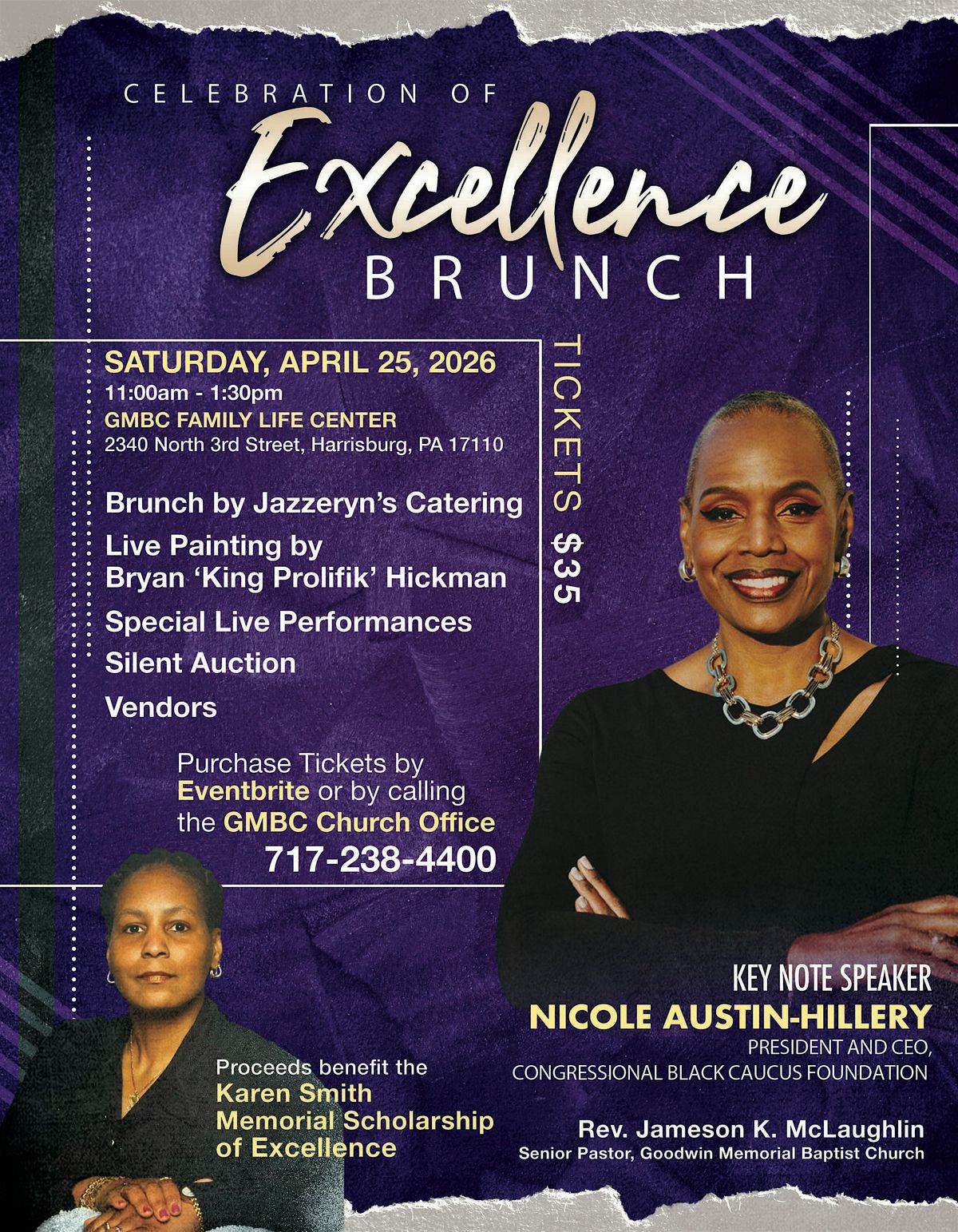 Goodwin Memorial Baptist Church invites you to join us for an exciting "Celebration of Excellence Brunch" scholarship fundraiser. This event includes brunch by Jazzeryn's Catering, Live Painting by Bryan "King Prolifik" Hickman, Special Live Performances, Silent Auction and Vendors. Proceeds from the brunch will benefit the Karen Smith Memorial Scholarship of Excellence.