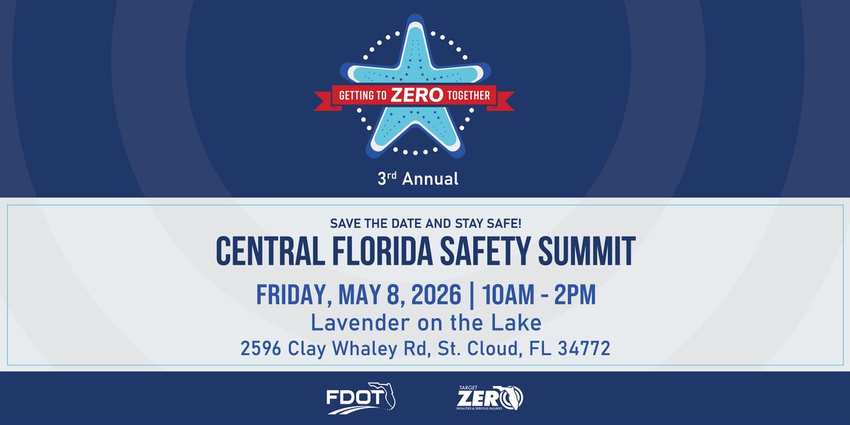 Join the Florida Department of Transportation District Five Office of Safety at the 3rd Annual Central Florida Safety Summit on Friday, May 8, 2026, from 10:00 AM to 2:00 PM. We're bringing Central Florida partners together to celebrate Vision and Target Zero efforts and to share the latest tips, tricks, and trends to keep everyone safe. The event will be held at Lavender on the Lake, 2596 Clay Whaley Rd, St. Cloud, FL 34772.