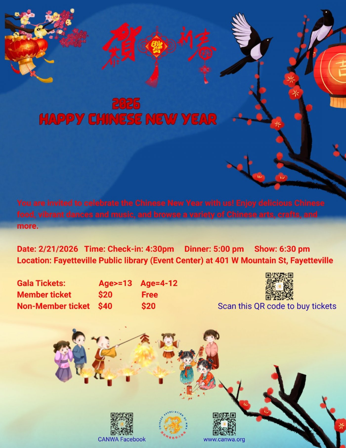 Join the Chinese Association of Northwest Arkansas (CANWA) for an evening of vibrant performances, cultural showcases, and festive traditions as we welcome the Lunar New Year. Enjoy music, dance, and community celebration in a joyful, family-friendly atmosphere that brings people together to share Chinese culture and New Year blessings.