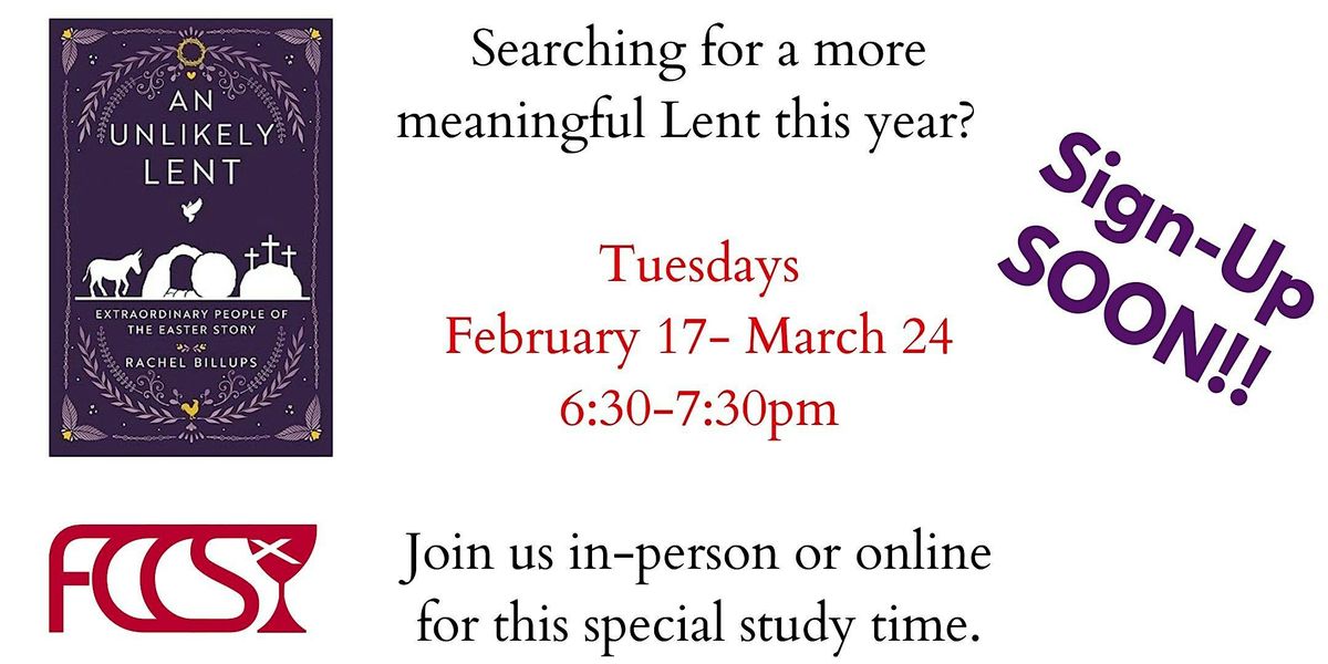 Are you interested in something new this Lent, to bring the meaning of Easter a little closer to your life today? This study is hosted by First Christian Church and is open to everyone, whether a member or not. Using the study guide, "An Unlikely Lent" by Rachel Billups, participants will review together in a weekly session either online or in-person.