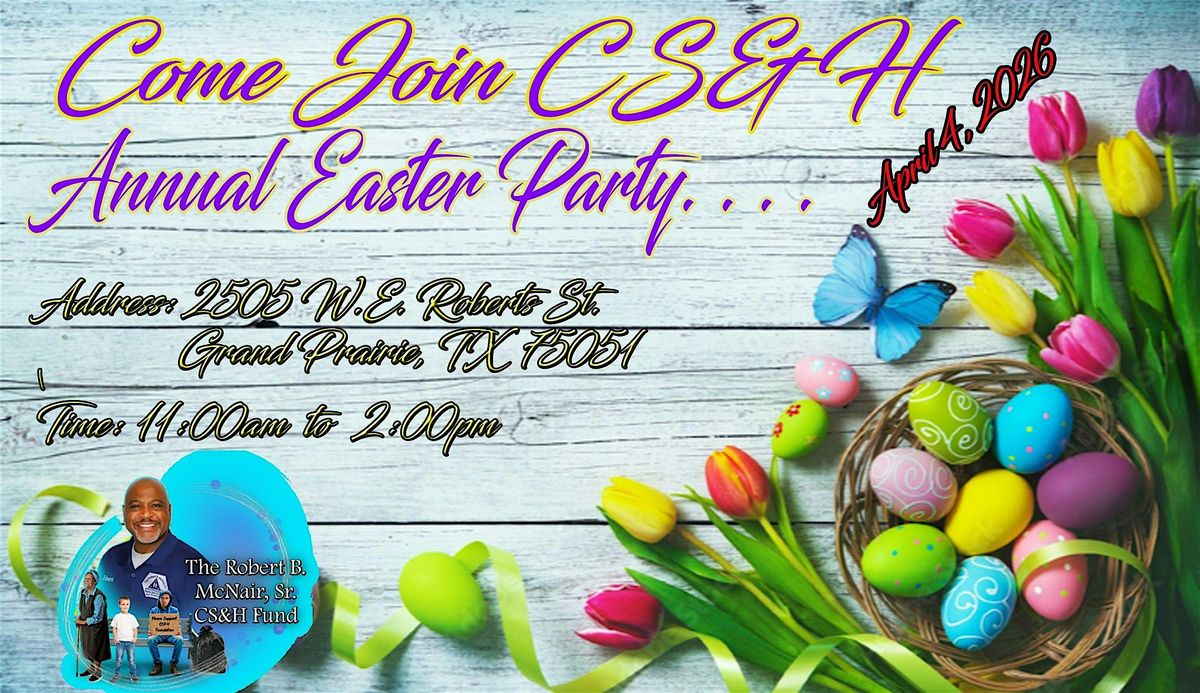 Hey there! Join us for the 2026 CS&H Easter Party happening on April 4, 2026 at 11:00 AM (Central Time). We'll be gathering in person at 2505 W.E. Roberts St for some fun, food, and good vibes. We will be having games and giving away a lot of outdoor prizes for the upcoing Summer. This event is for kids ages 1-10 years old, and Parents/Gardians MUST ACCOMPANY CHILD.