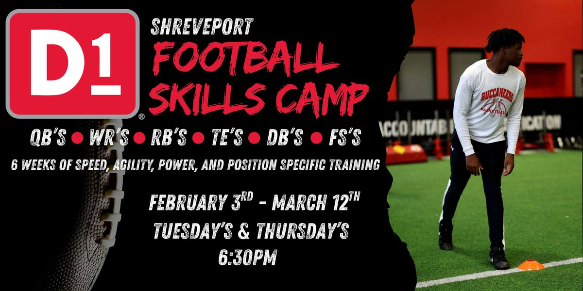 Improve your football skills with elite training from D1! Six weeks of coaching to blend speed, agility, and power with the skills needed to increase football performance! This camp will start February 3rd and end March 12th. Classes will be run every Tuesday and Thursday at 6:30pm and be 1 hour long. Come learn from former and current collegiate and pro players at D1!