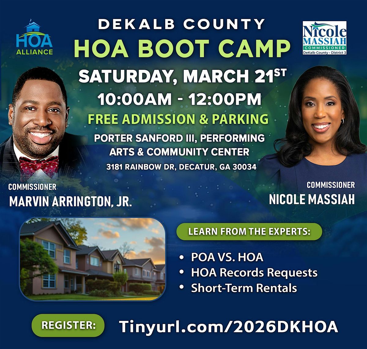 Join Commissioner Marvin Arrington, Jr. and Commissioner Nicole Massiah for a free community workshop covering the issues that affect HOA, COA, and POA members across DeKalb County.
