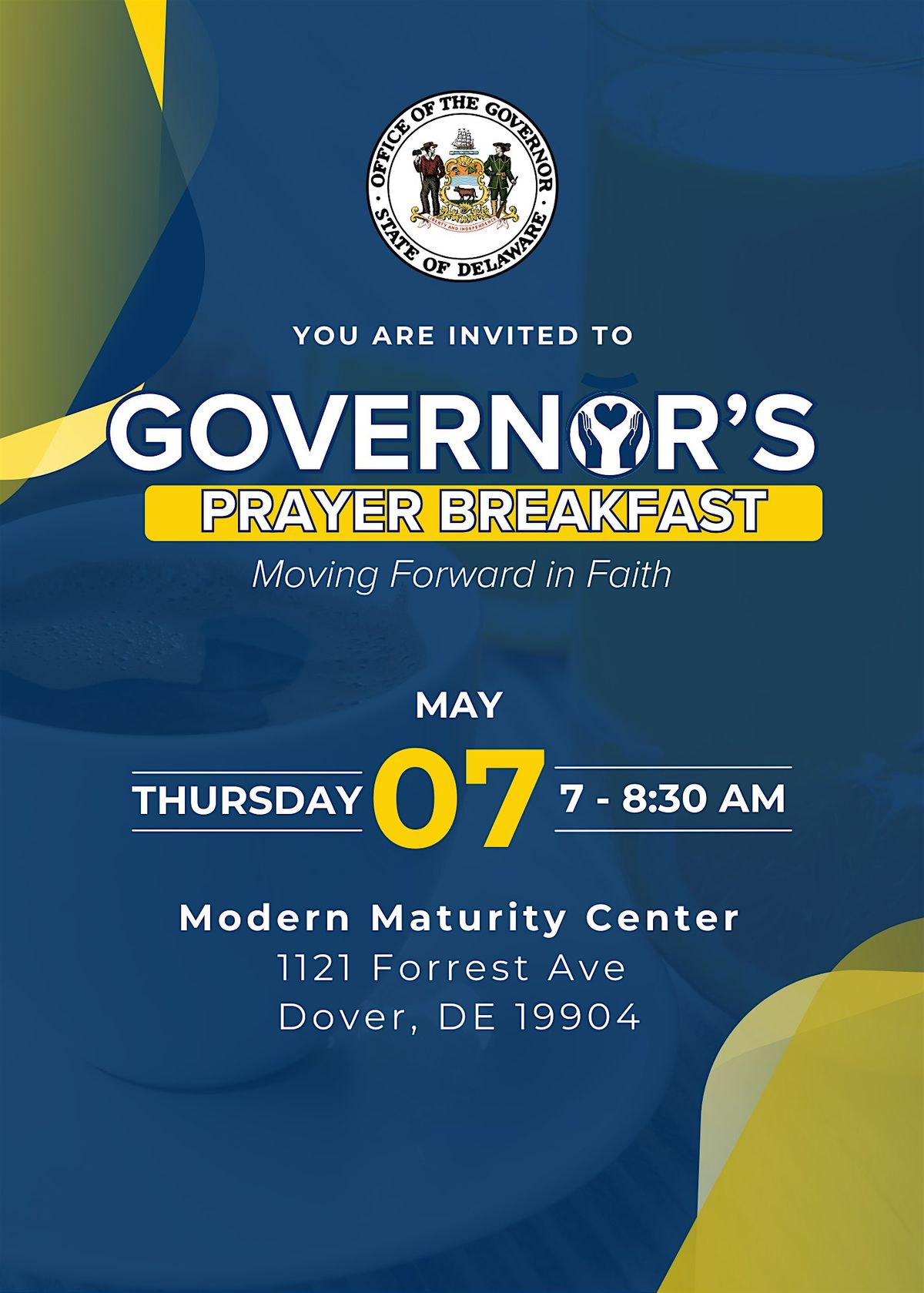 Welcome to the 2026 Delaware Governor's Prayer Breakfast! Join us for a morning of inspiration and interfaith fellowship at the Modern Maturity Center on May 7, 2026. The theme for this year is "Moving Forward in Faith" with keynote speaker Rev. Dr. Ronald W. Whitaker, II. Please join Gov. Matt Meyer and interfaith leaders for this opportunity to come together as a community to pray for Delaware and our state's future. We look forward to seeing you there!