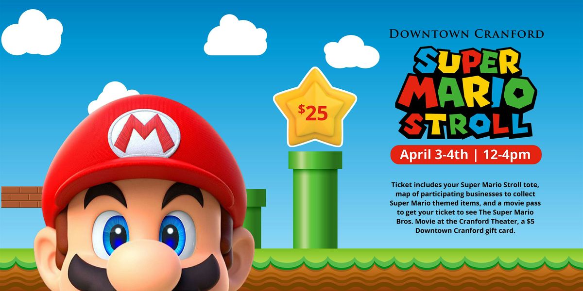 Celebrate Super Mario Day in Downtown Cranford by getting your ticket for the Super Mario Stroll! With each ticket, you will get a tote that will include a map of participating businesses to get your Super Mario themed item and a movie pass to get a ticket for The Super Mario Bros. Movie at the Cranford Theater as well as a $5 Downtown Cranford gift card. Please note that people who don't want a tote bag can purchase a ticket just for the movie at Cranford Theater.