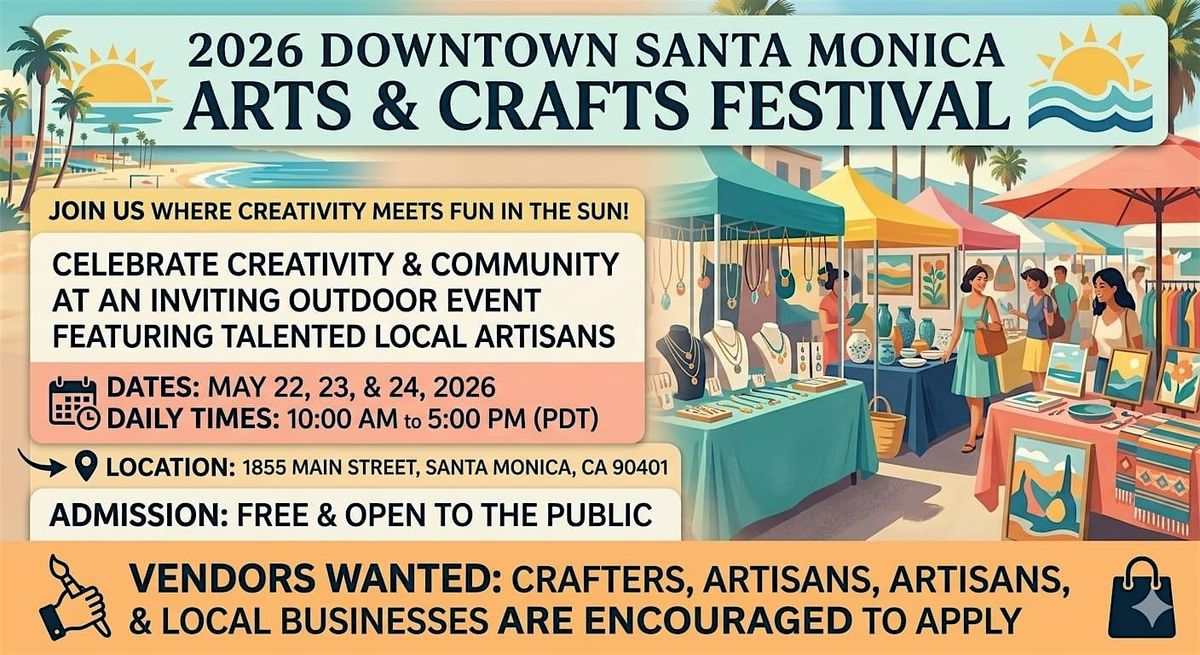 Celebrate creativity and community at the 2026 Downtown Santa Monica Arts & Crafts Festival—an inviting outdoor event where creativity meets fun in the sun! Discover unique handmade goods, specialty products, gifts, and seasonal finds from talented local artisans and crafters in a beautiful coastal marketplace.