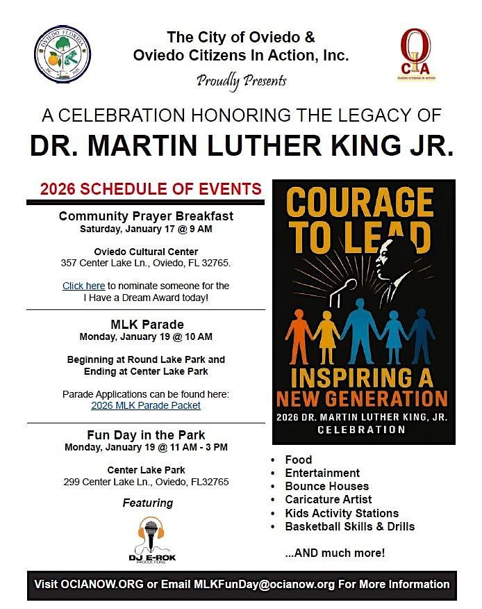 Join the City of Oviedo and Oviedo Citizens in Action for a day of celebration for Dr. Martin Luther King Jr. Starting at 10am, the MLK Day Parade will leave Round Lake Park and end at the main parking lot at the intersection of Center Lake Lane and Oviedo Boulevard. Following the parade will be a family fun day from 11am-3pm at Center Lake Park. There will be a DJ, vendors, inflatables for the kids, food trucks and come watch skills and drills from 1p-3p! You must register to be part of it.