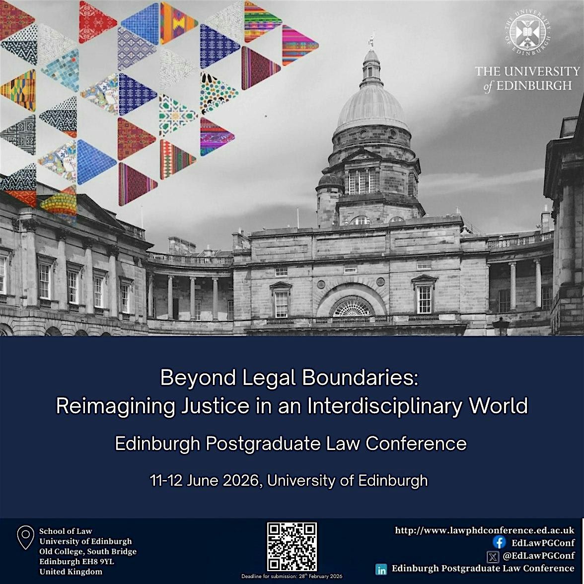The Edinburgh Postgraduate Law Conference (EPLC) 2026 invites participants to explore how law can respond to these evolving global realities. Under the theme “Beyond Legal Boundaries: Reimagining Justice in an Interdisciplinary World”, the conference will examine the legal, practical, ethical, and theoretical dimensions of governing an interconnected world. The theme encourages contributors to consider how jurisdiction, responsibility, or justice are transformed, particularly by global technological and environmental change. Intersectional perspectives are welcome, addressing how factors such as race, gender, class, geography or access to technology shape the experience and distribution of justice