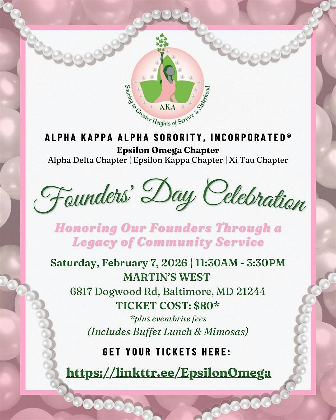 Come celebrate Founders' Day with the Epsilon Omega Chapter at Martin's West! Join us as we celebrate a heritage of sisterhood and community engagement. Each year, Epsilon Omega Chapter pauses to honor the Founders of Alpha Kappa Alpha Sorority, Incorporated®. Founded on the campus of Howard University in 1908, this year we celebrate 118 years of service to all mankind. It is the oldest Greek-Letter organization established by African American college-educated women. This year’s theme is “Honoring Our Founders Through a Legacy of Service.