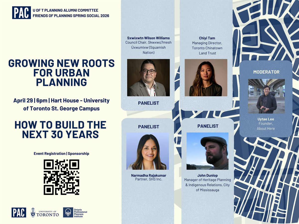 The University of Toronto Planning Alumni Committee is proud to host the Friends of Planning Spring Social again for 2026. This year, the Planning Alumni Committee celebrates it's 30th anniversary!