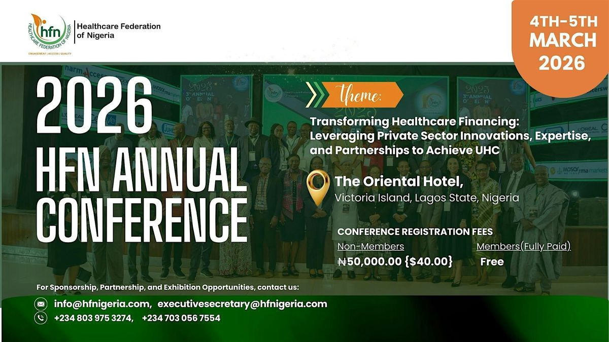 The Healthcare Federation of Nigeria (HFN) invites you to the HFN Annual Conference 2026, Nigeria’s premier gathering of private-sector healthcare leaders, policymakers, financiers, innovators, and development partners.