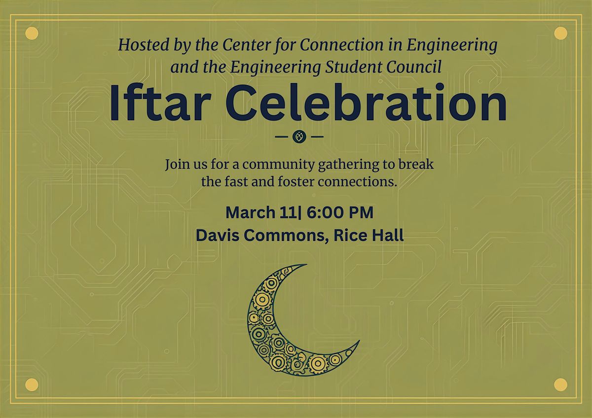 Join the Center for Connection in Engineering and the Engineering Student Council for a delightful evening of breaking fast together at the Davis Commons, in Rice Hall. Meal begins at 6:00pm.