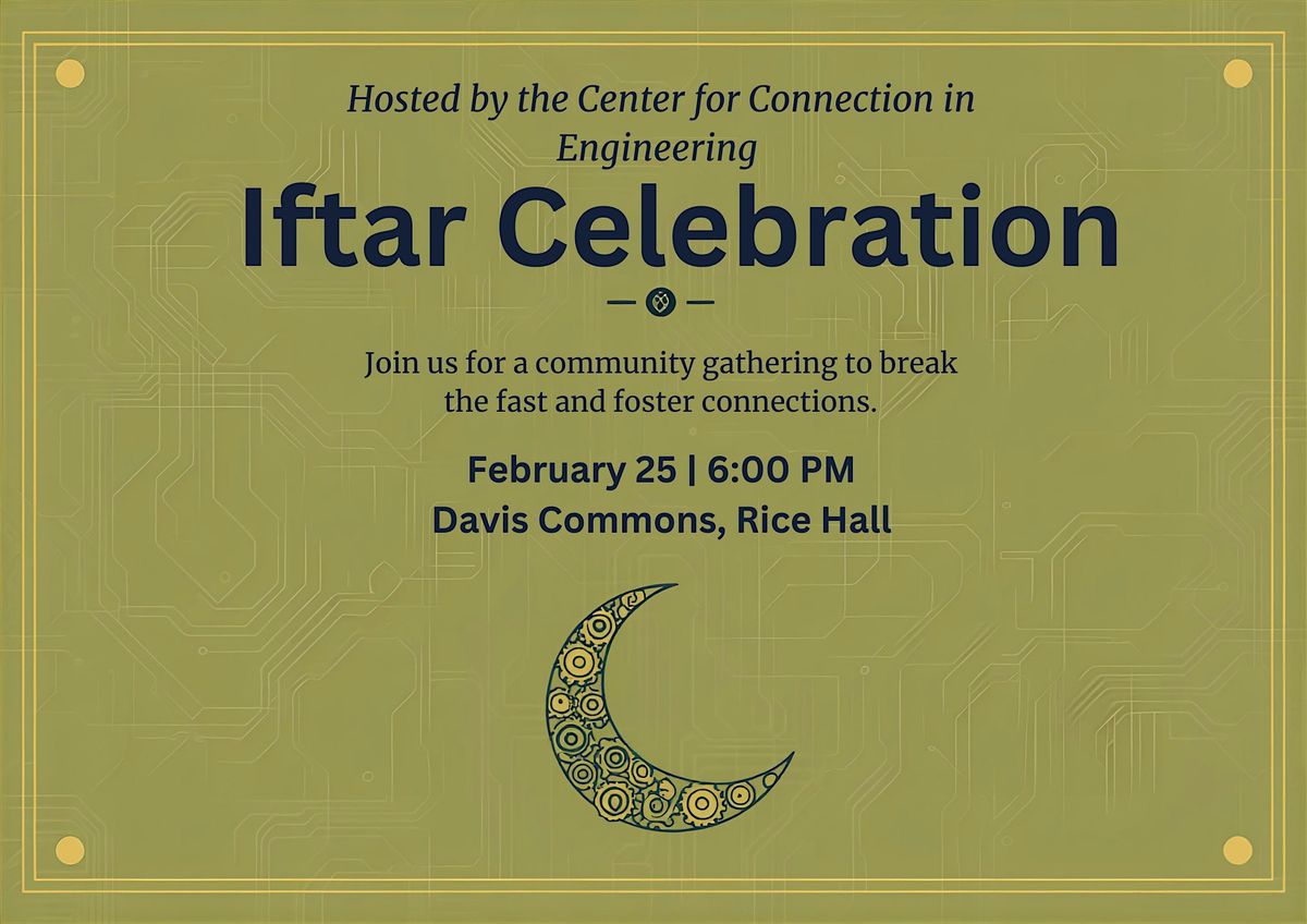 Join the Center for Connection in Engineering and the Engineering Student Council for a delightful evening of breaking fast together at the Davis Commons, in Rice Hall. Meal begins at 6:00pm. Space is limited, so please RSVP!