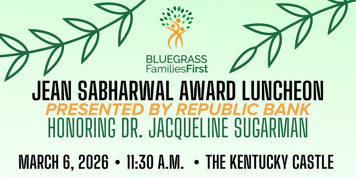 The 2026 Jean Sabharwal Award Luncheon, Presented by Republic Bank, will be held Friday, March 6, 2026 from 11:30 a.m. - 1:00 p.m. at The Kentucky Castle. Guests will enjoy a program, plated lunch & afternoon of community and celebration. The 2026 Jean Sabharwal Award will be presented to Dr. Jacqueline Sugarman: Professor of Pediatrics at the University of Kentucky ande medical director for the Children’s Advocacy Center of the Bluegrass and the Children’s Advocacy Centers of Kentucky. This luncheon is made possible by our various sponsors and supporters, including Republic Bank, Dan Neil Barnes Studio, Lexington-Fayette Urban County Government, The Kentucky Castle, Marshall Pediatrics, and Joanna Rodes LCSW. To learn more, visit www.bluegrassfamiliesfirst.com/jean-sabharwal-award. For questions, please contact Bluegrass Families First at [email protected] or (203) 895-2456.