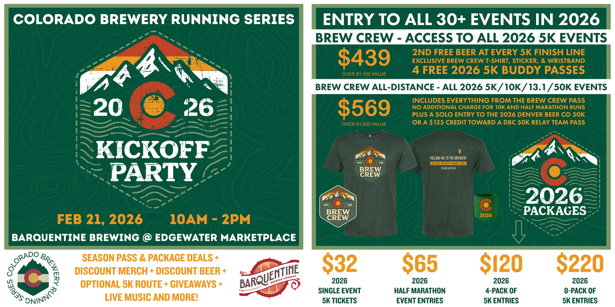 We are kicking off the 2026 season of the Colorado Brewery Running Series with a fun day of sales and ales at our 2026 Kickoff Party with Barquentine Brewing and the Edgewater Marketplace!