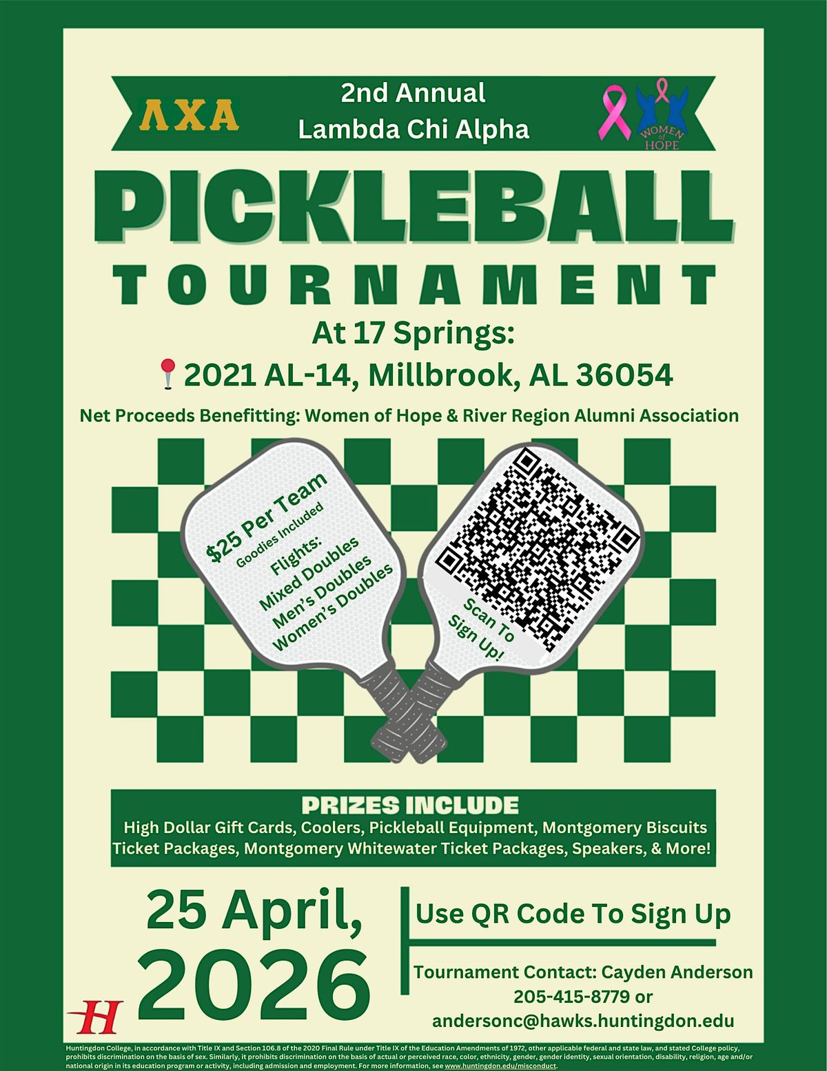 Come join us for a fun-filled day of pickleball at the 2026 Lambda Chi Alpha Pickleball Tournament at 17 Springs! All skill levels are welcome to participate in this exciting event that will raise funds for the Women of Hope and River Region Alumni Association.