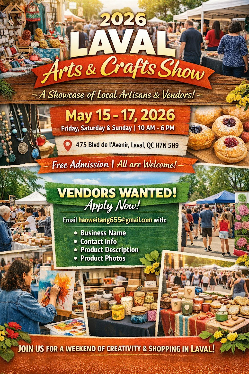 Celebrate creativity, community, and local entrepreneurship at the 2026 Laval Arts & Crafts Show—an exciting in-person marketplace featuring talented artisans, crafters, makers, food vendors, and small businesses from across the region. Discover unique handmade crafts, specialty foods, fashion items, home décor, beauty products, gifts, and more in a vibrant and welcoming festival atmosphere.