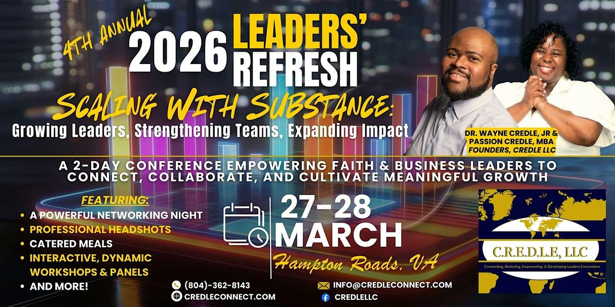 We cordially invite you to our 2026 Leaders' Refresh, which will be held Friday, March 27th-Saturday, March 28th in Hampton Roads, Virginia! We promise a time of empowerment, development, and a much needed retreat for executive and faith leaders.