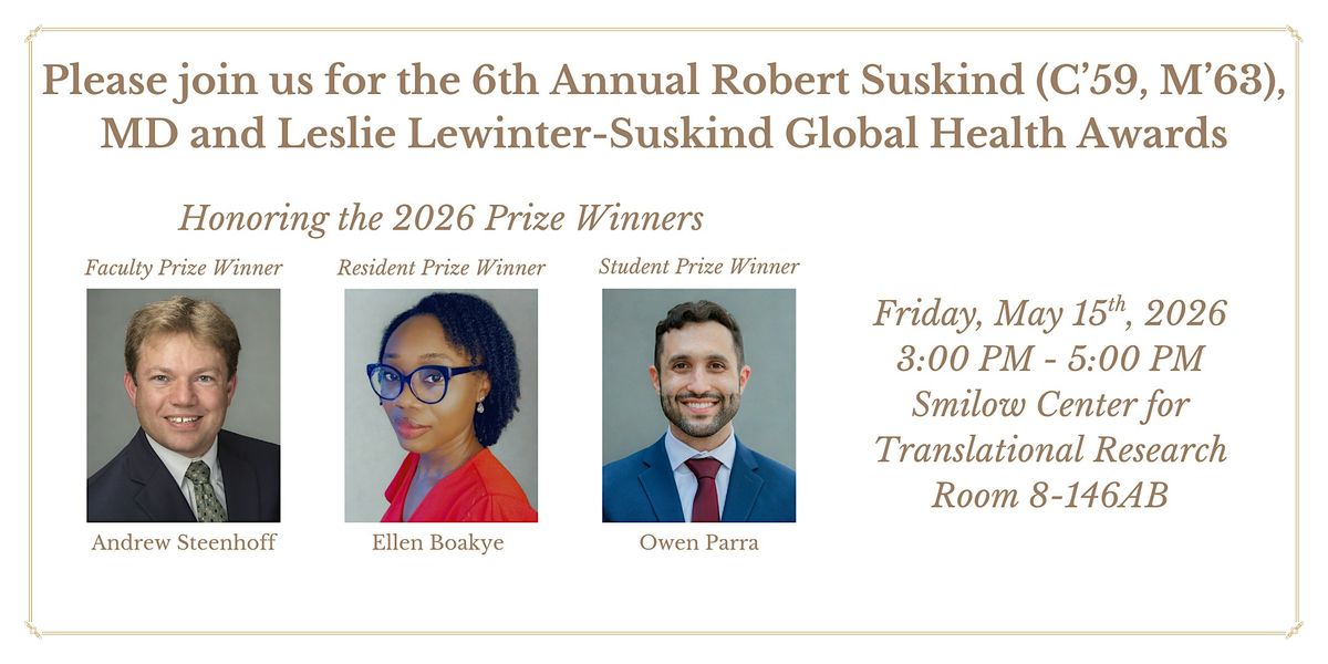 This year, the Suskinds have graciously endowed yet another prize recognizing residents who demonstrate an exceptional commitment to advancing global health equity and whose work reflects meaningful engagement in improving public health awareness, access to care, discovery and outcomes-based research, and/or medical education through collaborative and partnership-driven efforts.