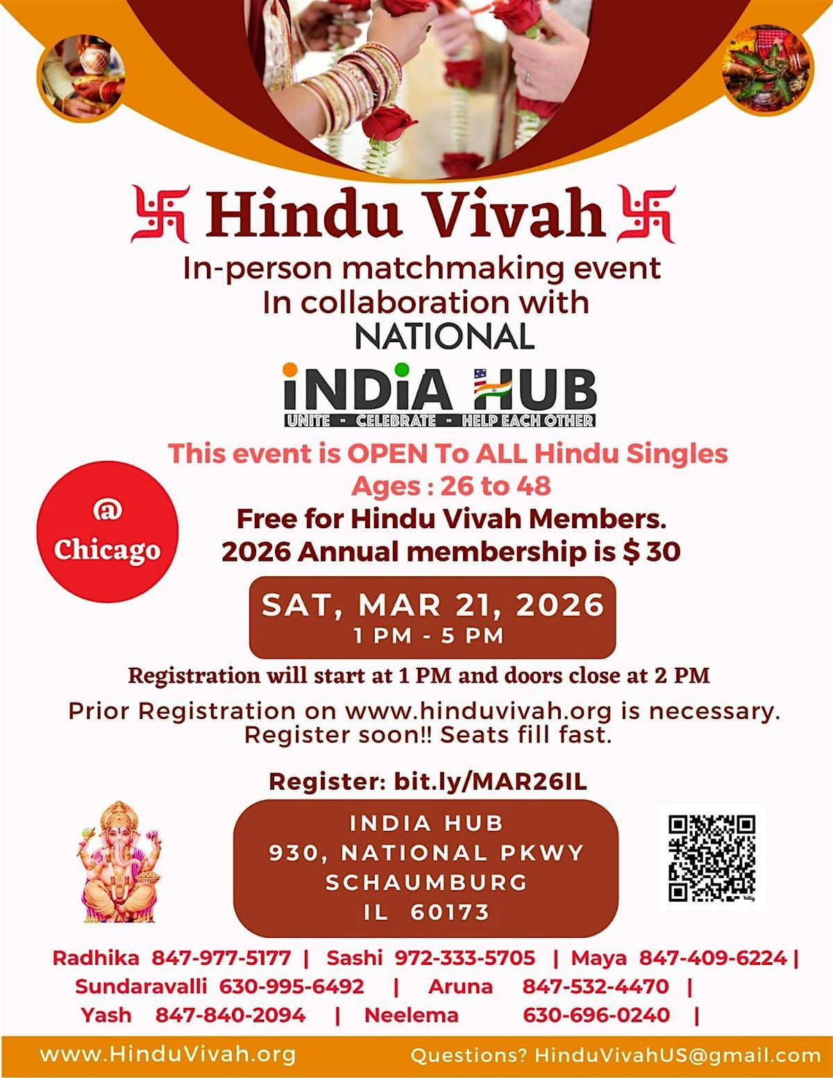 Due to limited seats and to avoid imbalanced gender ratios , some participants may be placed on a waitlist. If a spot becomes available, the Hindu Vivah team will contact you. For updates on your status, you may also reach out to us at [email protected]