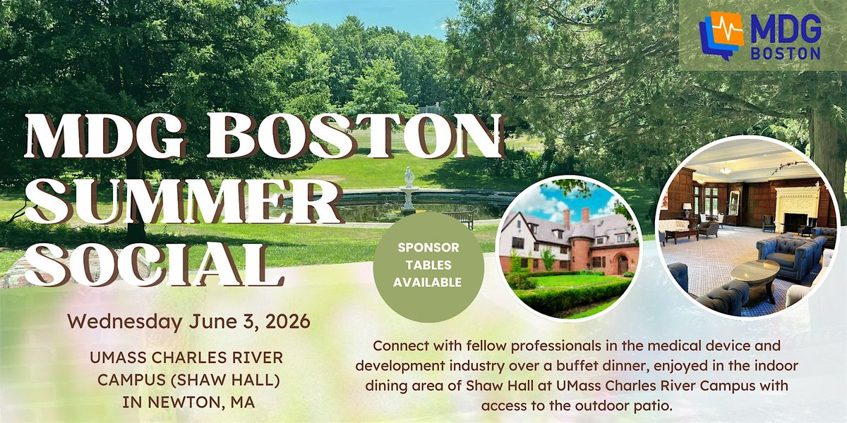 Join us on June 3rd for our annual MDG Boston Summer Social taking place this year at the UMass Charles River Campus in Newton, MA. The event will be held in the historic Shaw Hall building, with access to an outdoor patio for guests to enjoy. Connect with fellow professionals in the medical device and development industry while enjoying a buffet-style dinner.