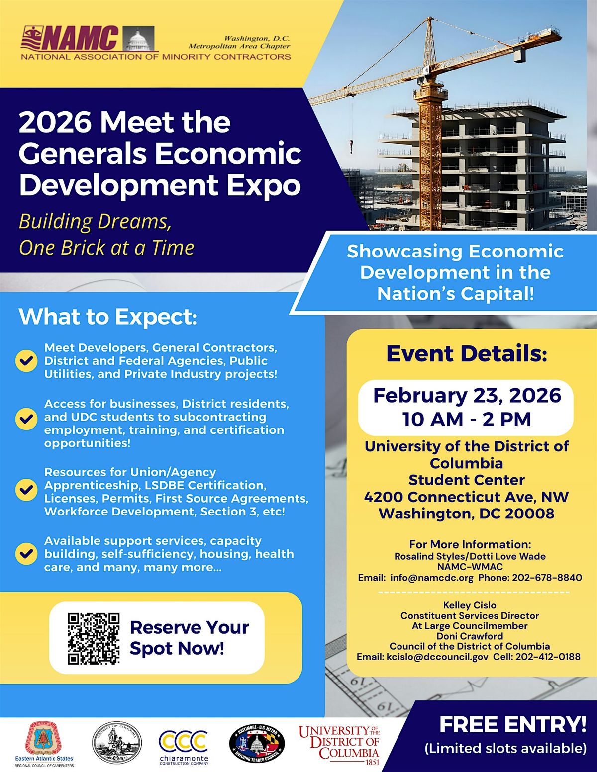 The National Association of Minority Contractors—Washington, DC Metropolitan Area Chapter (NAMC-WMAC) with the support of At-Large Councilmember Doni Crawford, the University of the District of Columbia, Chiaramonte Construction Company, Eastern Atlantic Council of Carpenters and the Baltimore-DC Building Trade Council are hosting the “2026 Meet the Generals Economic Development Expo” designed to showcase economic development initiatives that are currently under construction and/or planned in the District of Columbia.
