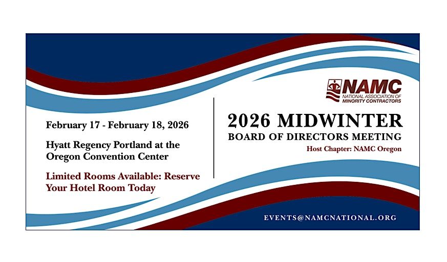 Join NAMC leaders, chapter representatives, industry partners, and subject-matter experts for the 2026 Midwinter National Meeting, a two-day convening focused on policy, practice, and positioning minority contractors for success in a rapidly evolving contracting environment.