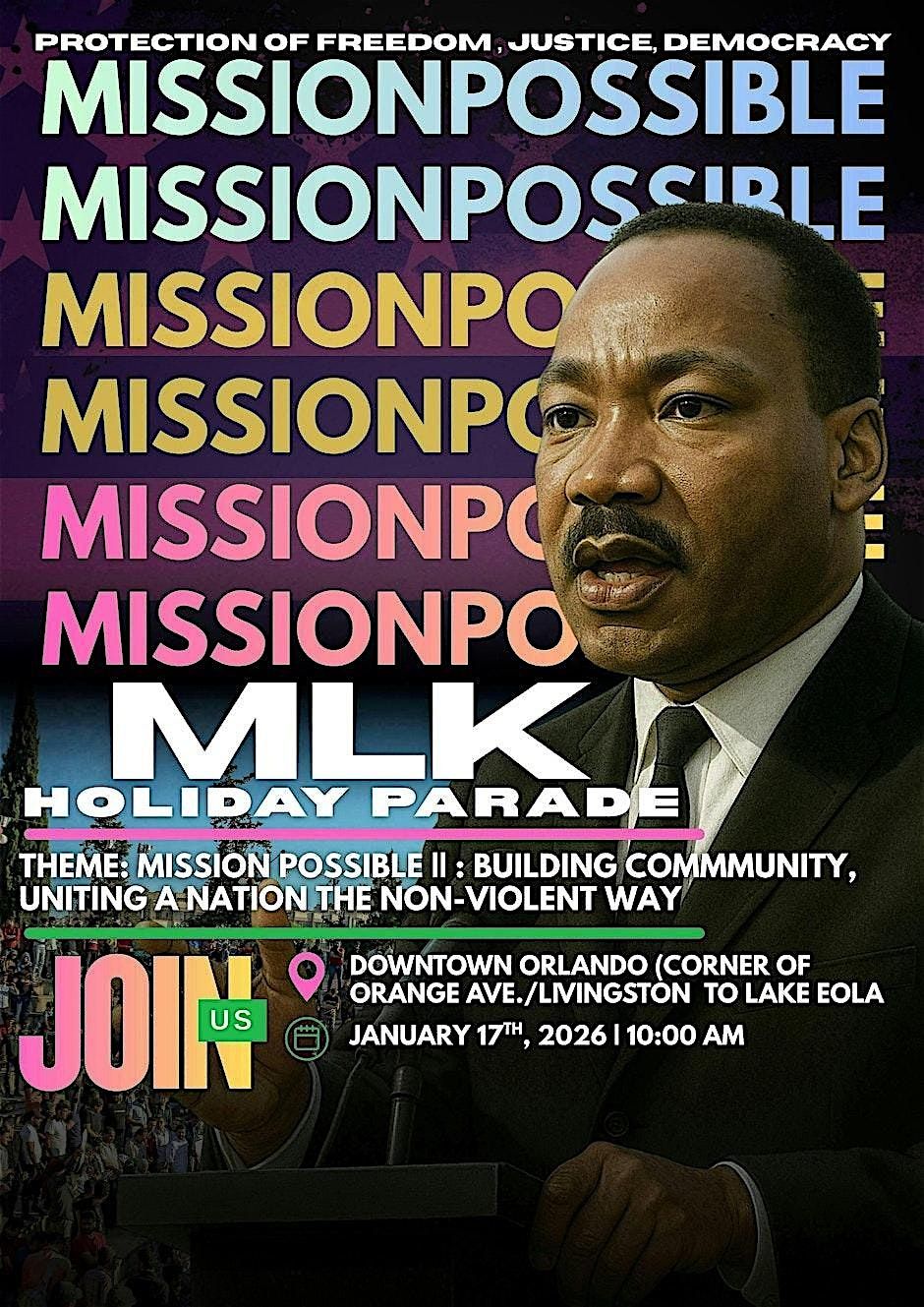 Join us in honoring the legacy of Dr. Martin Luther King Jr. at the MLK Holiday Parade as we come together to celebrate freedom, justice, and democracy!
