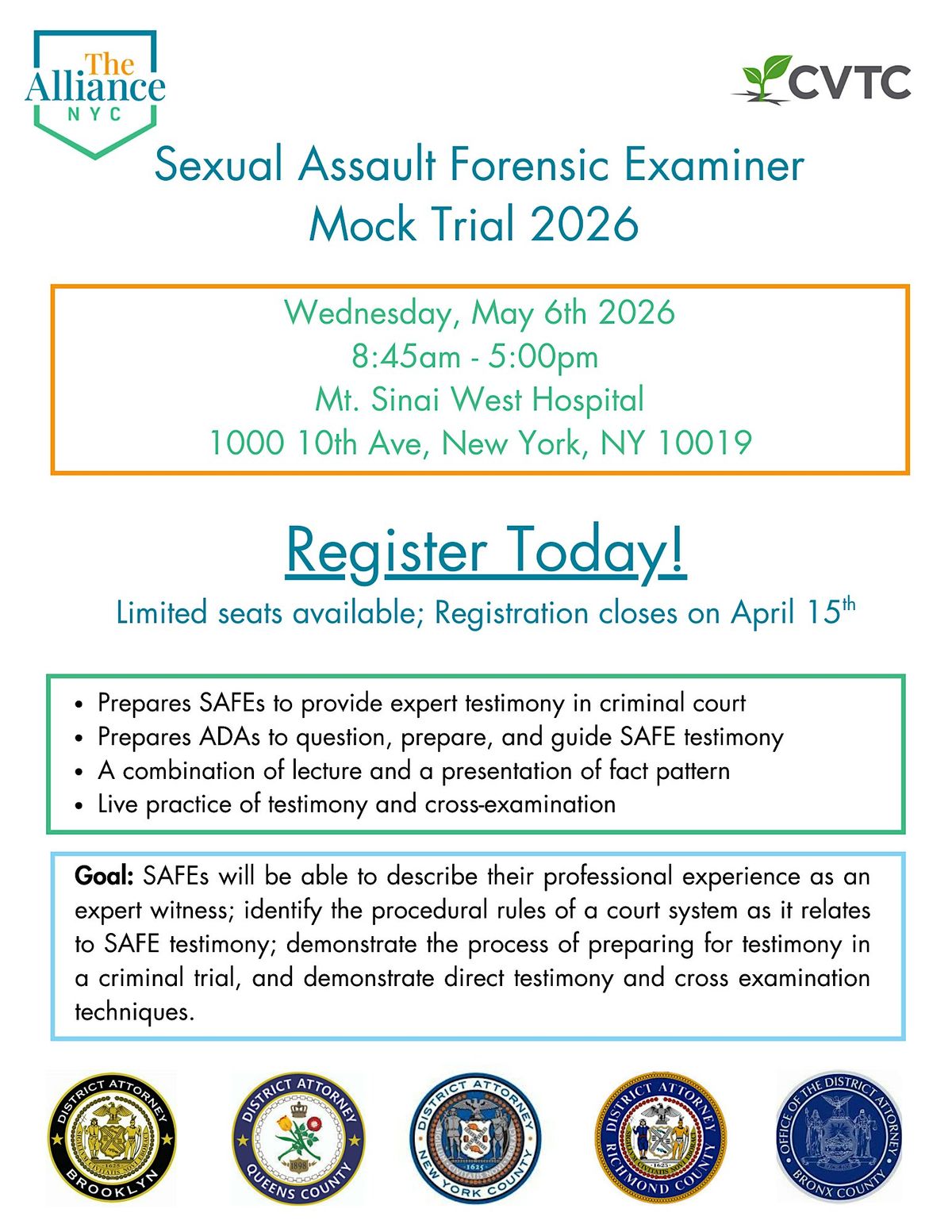 This training session combines the expertise of the New York City Alliance Against Sexual Assault, Crime Victims Treatment Center, all five New York City District Attorney’s Offices, and an experienced Sexual Assault Forensic Examiner to prepare SAFEs and ADAs alike for court testimony. Using a combination of lecture, a presentation of fact pattern, and demonstrations participants will experience the process of testifying in court, and later have an opportunity to practice skills during training.