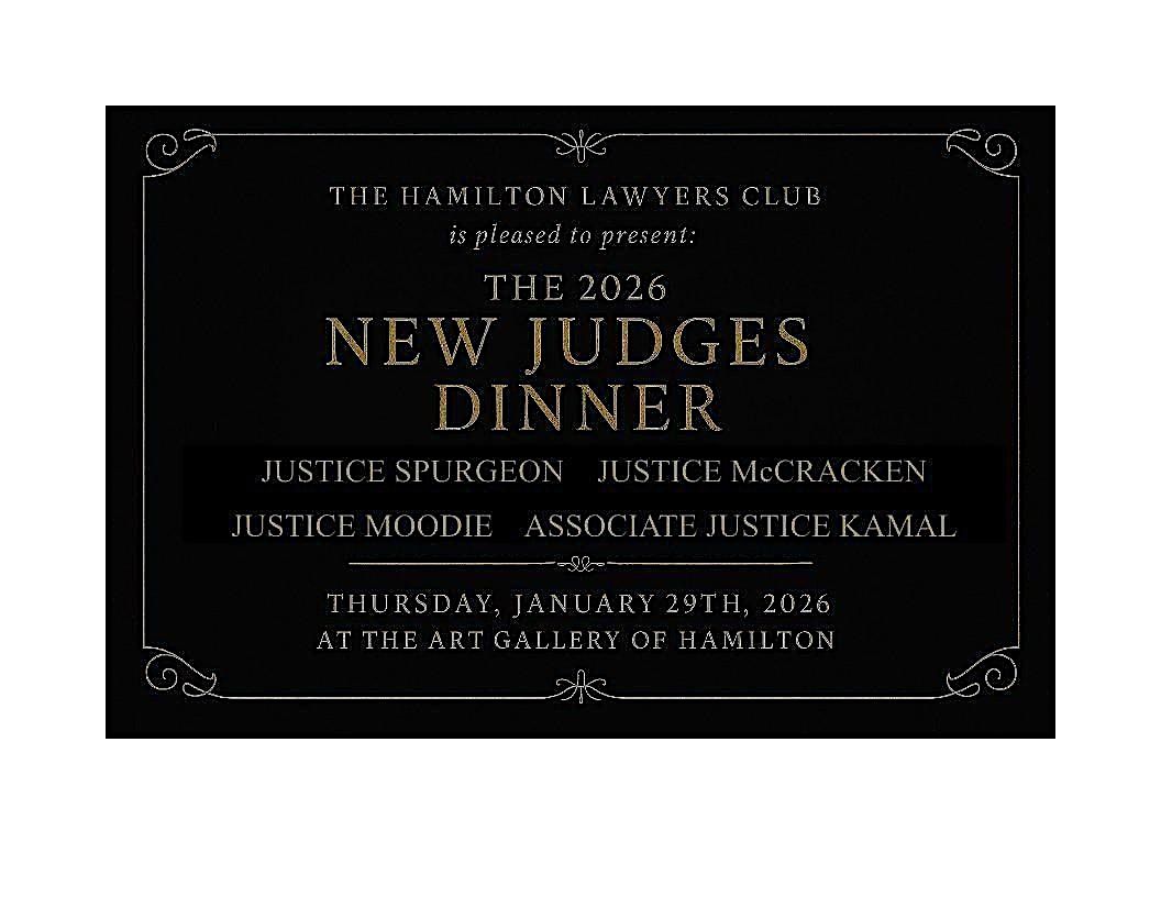The Hamilton Lawyers' Club is pleased to invite our members of the Hamilton Legal Community to the 2026 New Judges Dinner.