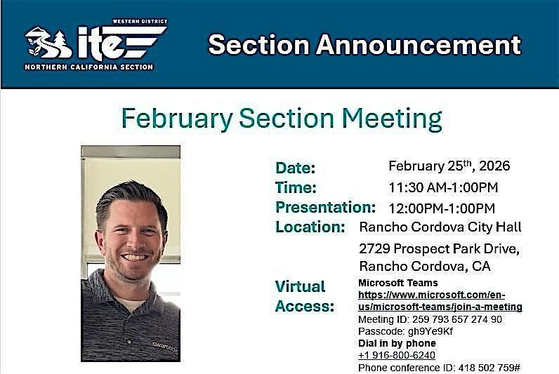 Please join us in the 2026 NorCal ITE February Section Meeting in person at Rancho Cordova City Hall or online: