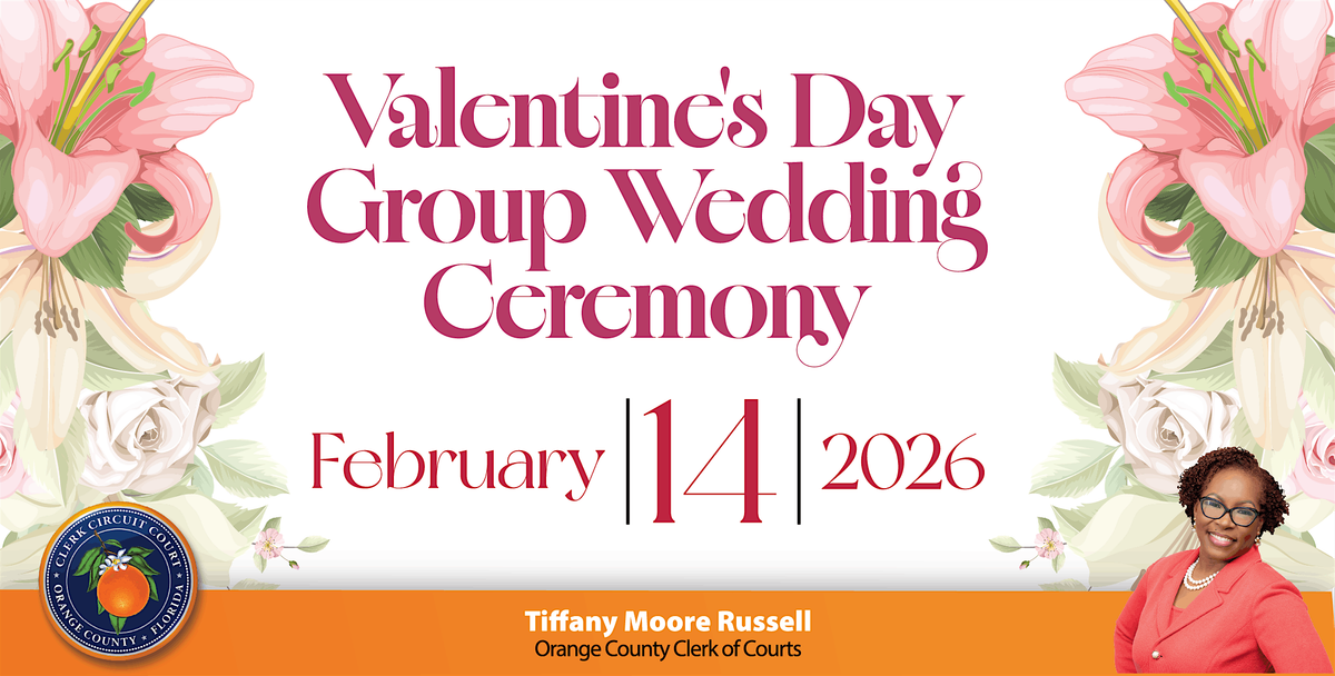 The Orange County Clerk of Courts Office will once again hold a group wedding ceremony on Valentine's Day. We invite you and your family to join us and other couples to exchange vows in a picturesque botanical garden setting filled with romance at Celebration Gardens in Winter Park on Saturday, February 14th, at 11:00 a.m.
