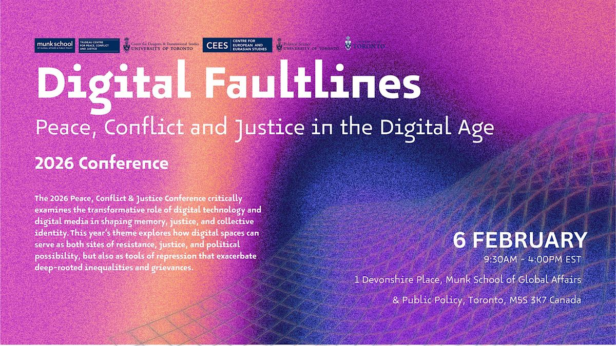Welcome to Digital Faultlines: Peace, Conflict and Justice in the Digital Age happening at the Campbell Conference Facility at 1 Devonshire Pl on February 6, 2026 from 9:30 AM - 4:00 PM (Eastern Standard Time). Join us for a day filled with insightful discussions and networking opportunities. This conference aims to bring together experts and students passionate about topics related to peace, conflict, and justice. Don't miss out on this opportunity to learn, connect, and be inspired! Mark your calendars and be part of this impactful event.
