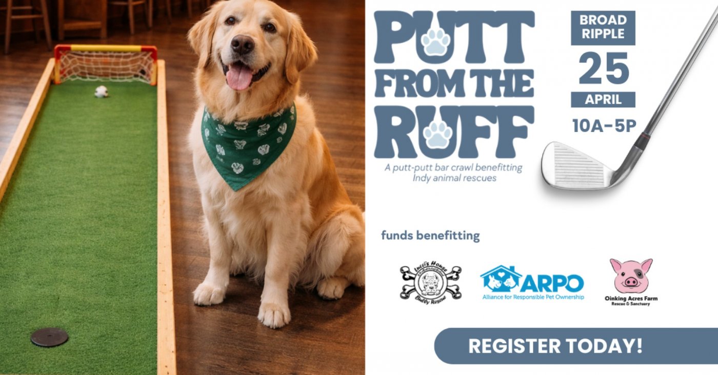 Putt From the Ruff is part mini-golf, part bar crawl, part animal-rescue fundraiser. Teams traverse multiple bars in Broad Ripple, each bar hosting its own fun “putt-putt” style hole, while also enjoying drink specials and mingling with adoptable rescue pets.