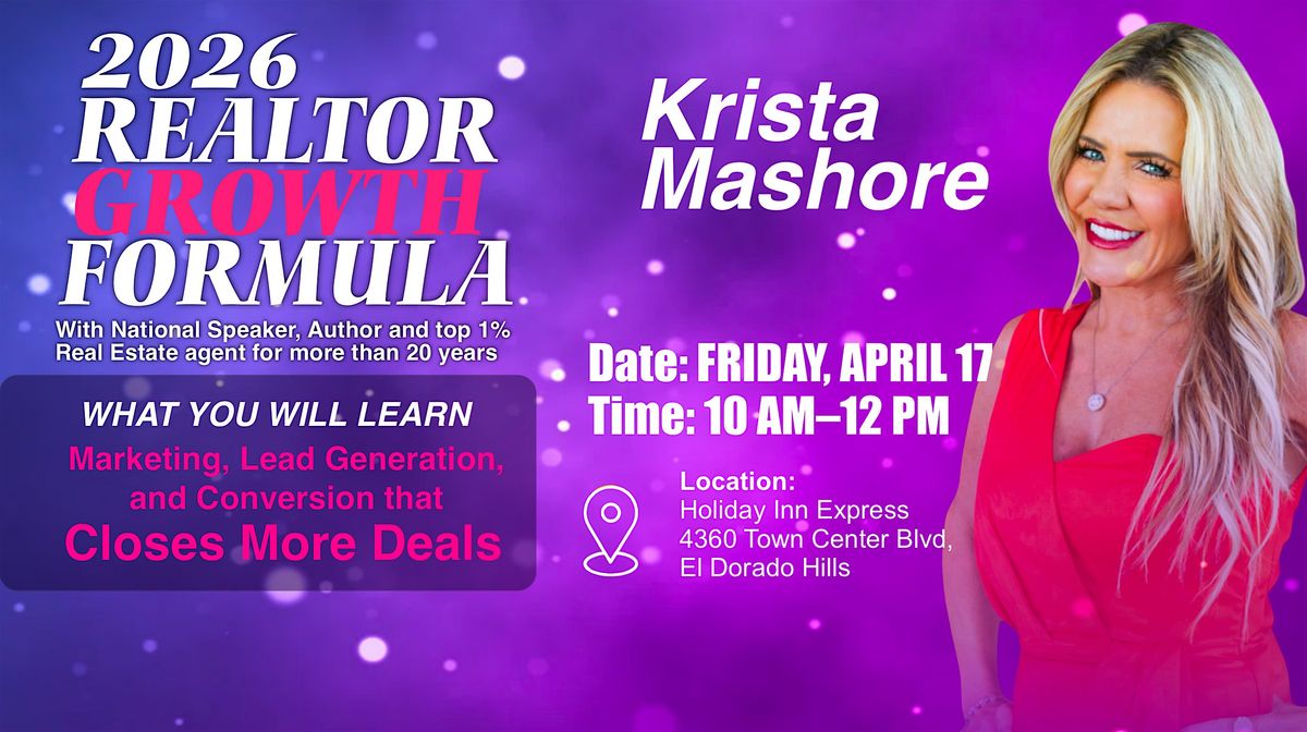 Krista Mashore is coming to El Dorado Hills and you will not want to miss it! Krista is a National Speaker, Author and top 1% Real Estate agent - for more than 20 years! She is going to share her secrets that have helped her grow her business exponentially every year! Marketing, Lead Generation, and Lead Conversion that will help you CLOSE MORE DEALS! Reserve your spot today. Lunch and networking provided after the training.